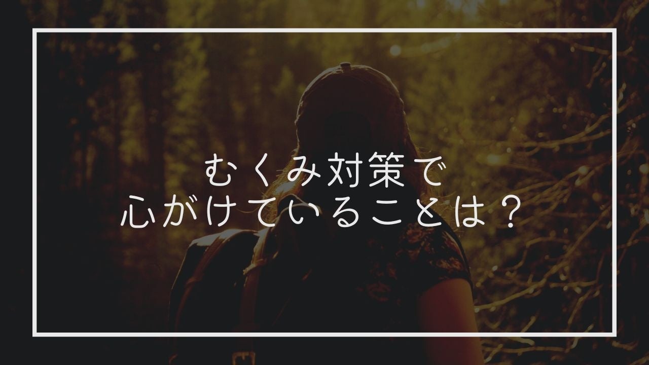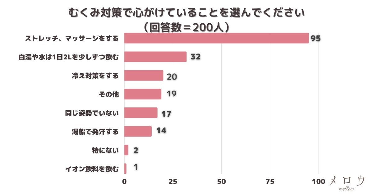 「ストレッチ、マッサージをする」がむくみ対策として圧倒的に人気でした。お風呂あがりにストレッチをしたり、お風呂でマッサージをしたりすると血行がよくなって効果を感じやすいですよね。