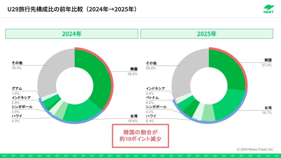 株式会社令和トラベル(本社:東京都渋谷区、代表取締役:篠塚 孝哉)が運営する、かしこい、おトク、旅行アプリ『NEWT(ニュート)』は、2025年7月15日〜9月30日までのNEWTにおける予約データをもとに、U29世代における2025年夏休み海外旅行トレンドを発表しました。2025年の夏休みは、“韓国一強”だった海外旅行先の構図から変化し、ハワイ・シンガポール・ベトナムなどの割合が増加し、旅先の多様化が進んでいることが明らかになりました。