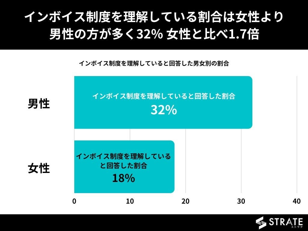 【インボイス制度を理解している割合は女性より男性の方が多く32% 女性と比べ1.7倍】