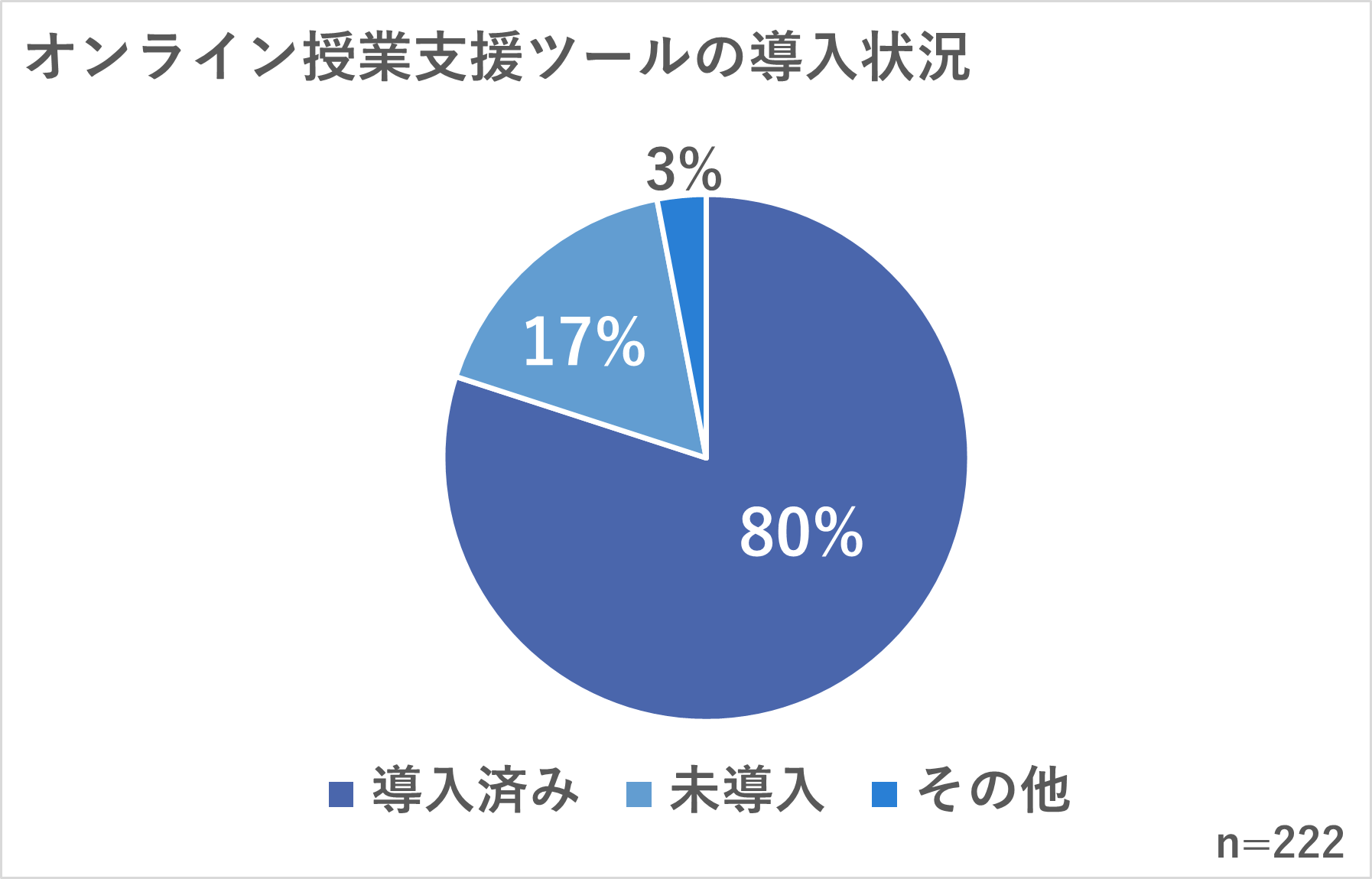 222自治体にオンライン授業支援ツールの導入状況を聞いたところ、導入していると答えたのは178自治体(80%)、導入していないが37自治体(17%)。(n=222)