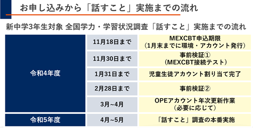 文部科学省が実施する令和5年度全国学力・学習状況調査において、中学校3年生英語の「話すこと」調査をオンライン方式で実施することが計画されています。「話すこと」調査は、文部科学省が提供するCBTシステム「MEXCBT」を活用し、児童生徒それぞれ1人1台の端末から、高速ネットワークを介して実施される予定で、「MEXCBT」に対応した学習eポータルの導入が必要になります。また本調査は全国9500校を対象に行われる予定で、多くの小中学校が対応に迫られると思われます。