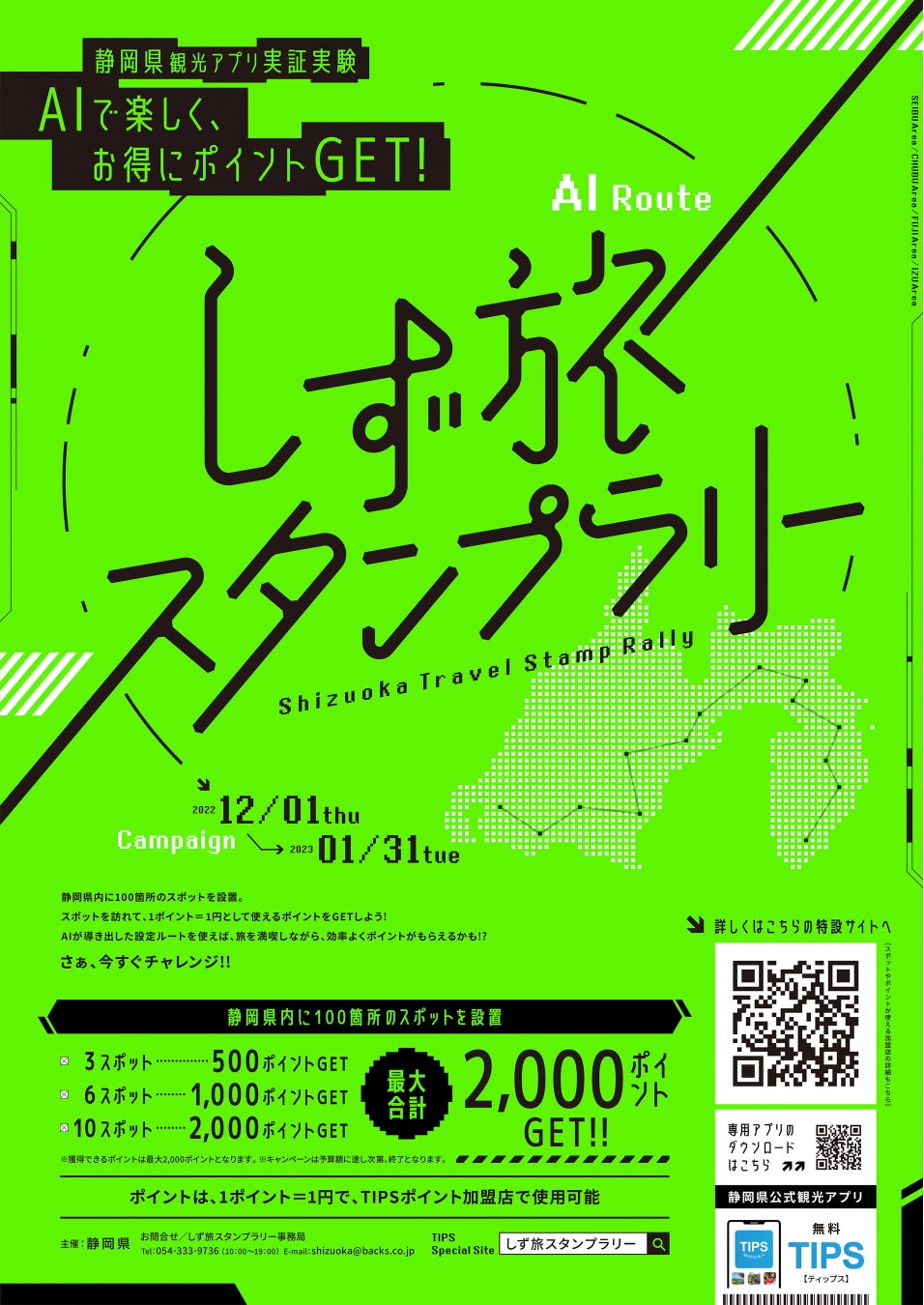静岡県(県知事:川勝 平太)では、観光デジタル情報プラットフォーム事業※1の一環として、2021年3月に稼働を始めた静岡県公式観光アプリ「TIPS」(ティップス)※2を活用した県内周遊促進実証実験キャンペーン「しず旅スタンプラリー」(https://shizutabi-stamp-rally.com)を、本年12月1日(木)から2023年1月31日(火)まで、株式会社静岡博報堂(代表取締役社長:中島 浩二)に委託して実施いたします。