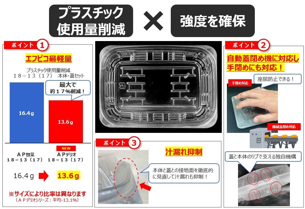 エフピコ 新製品「APデリオ」シリーズを発売 プラスチック使用量最大17%削減、自動・手動の蓋閉めに対応し、環境配慮と使いやすさを両立した惣菜容器