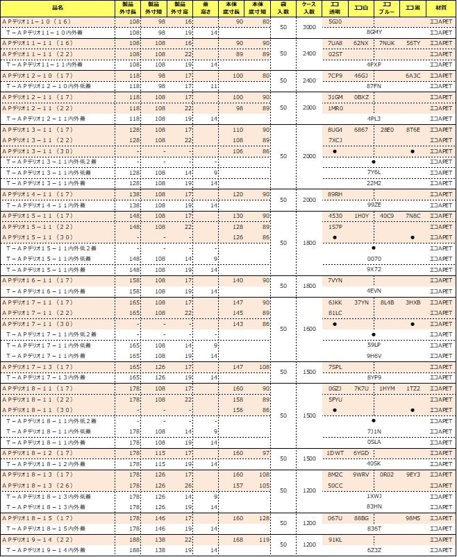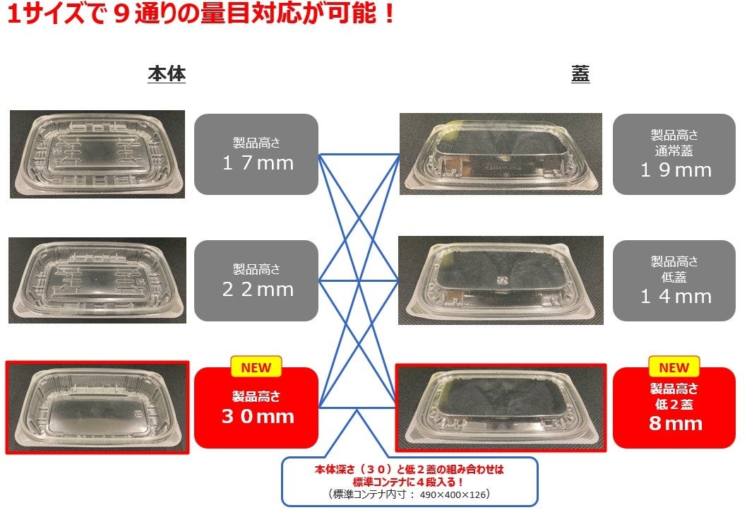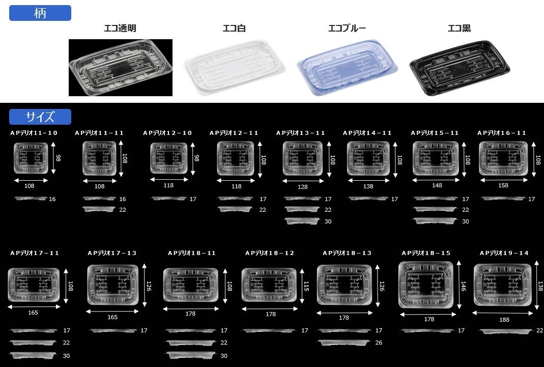 APデリオシリーズには、11-10から19-14まで、幅広い本体サイズがあります。また、本体深さ(16mm、17mm、22mm、26mm、30mmなど)と、通常蓋、低蓋、低2蓋といった異なる高さの蓋を組み合わせることで、一つの本体サイズで最大9通りの量目(内容量)に対応できるタイプもございます。これにより、様々な種類の惣菜や量に対応可能です。エコ透明、エコ白、エコブルー、エコ黒といった柄の選択肢もあります。新製品「APデリオ」シリーズは、惣菜業界における自動化ニーズと環境配慮の潮流に応えつつ、使いやすさも追求した、新しい時代の惣菜容器です。