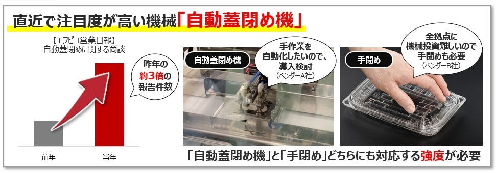 食品トレー・容器メーカー/株式会社エフピコ(本社:東京都新宿区)は、この度、惣菜容器の新製品として「APデリオ」シリーズを開発し、発売いたしました。近年、惣菜を製造・販売する現場では、プロセスセンター(PC)の新設や増設が進み、容器の蓋閉め作業において自動蓋閉め機の導入が進んでいます。実際、自動蓋閉め機に関する商談報告件数は、前年の約3倍に増加しており、高い注目を集めています。しかし、同時に全ての拠点で機械化を進めることは難しいため、手作業での蓋閉めも引き続き行われています。このような背景から、惣菜容器には「自動蓋閉め機にも手作業での蓋閉めにも対応できる強度」が求められています。