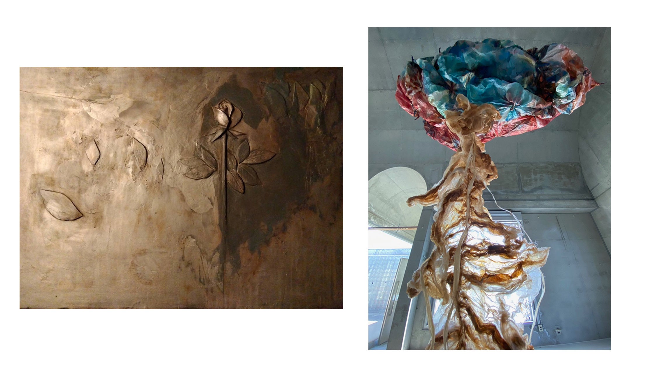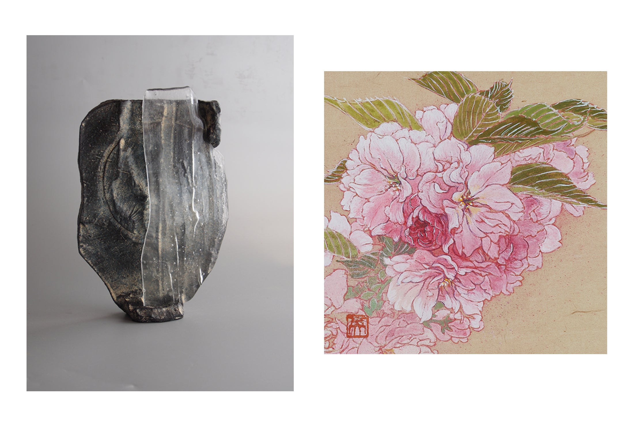 土の塊からイメージされたフォルムの器、オブジェ。馨りを感じる豊かな色彩の絵画。陶芸と日本画の分野で活動する二作家が、互いに時と空間を共有し、春への想いを紡ぎます。