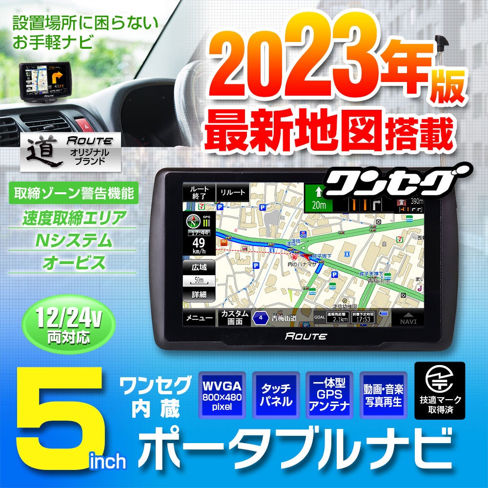 2023年版地図搭載、コンパクトな5インチサイズで設置場所にも困りません。