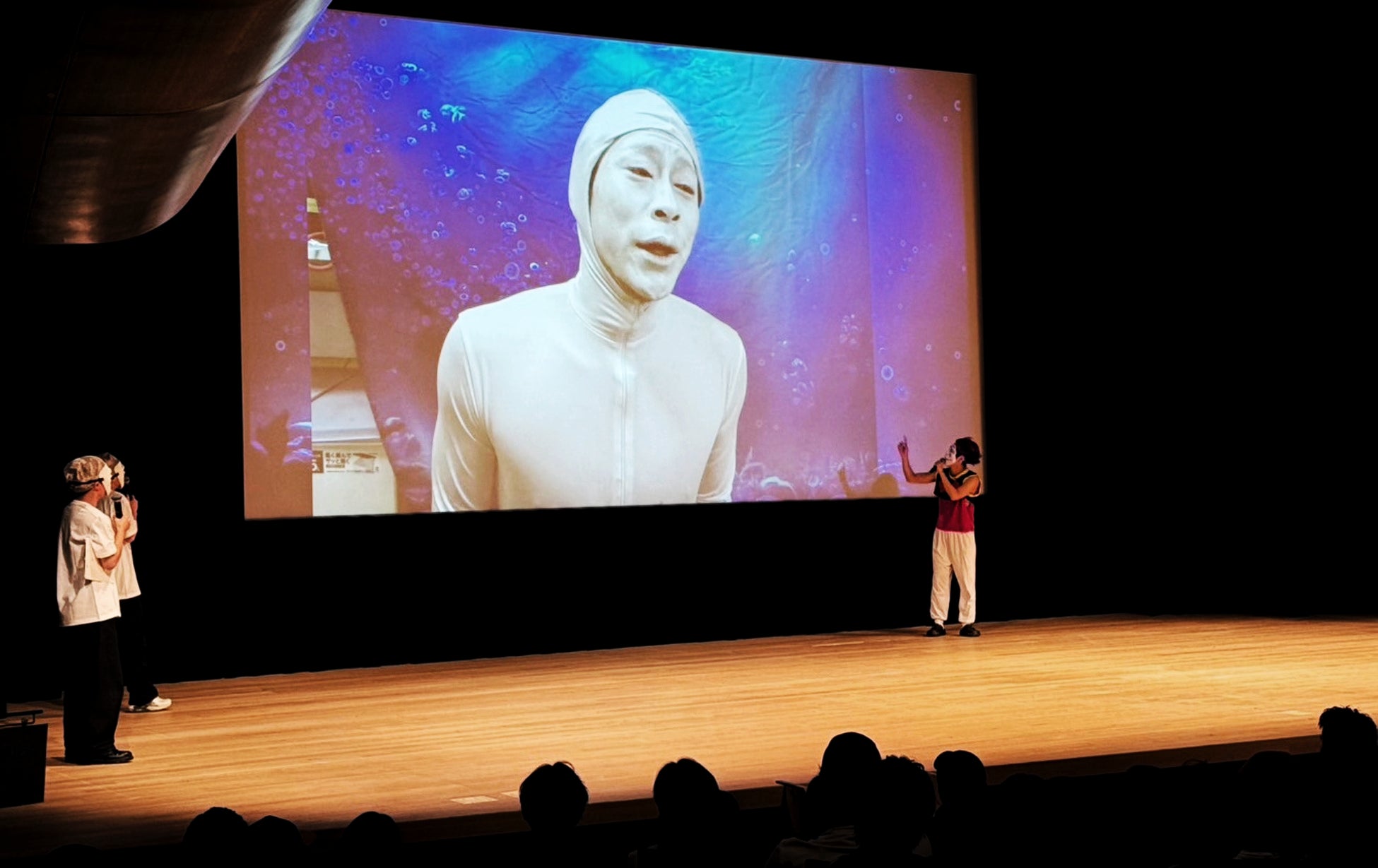 ステージにカメのぬいぐるみが投げ込まれたかと思えば、袖から終わった人が突然登場!