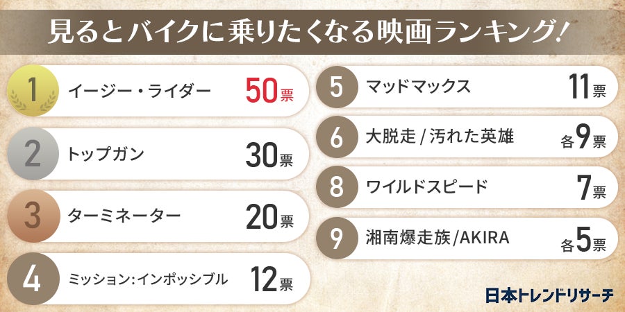 日本トレンドリサーチ(運営会社:株式会社NEXER)は、RIDEZ株式会社と共同で「見るとバイクに乗りたくなる映画」に関するアンケートを実施し、結果をサイト内にて公開したので紹介します。