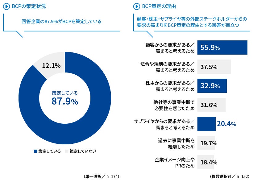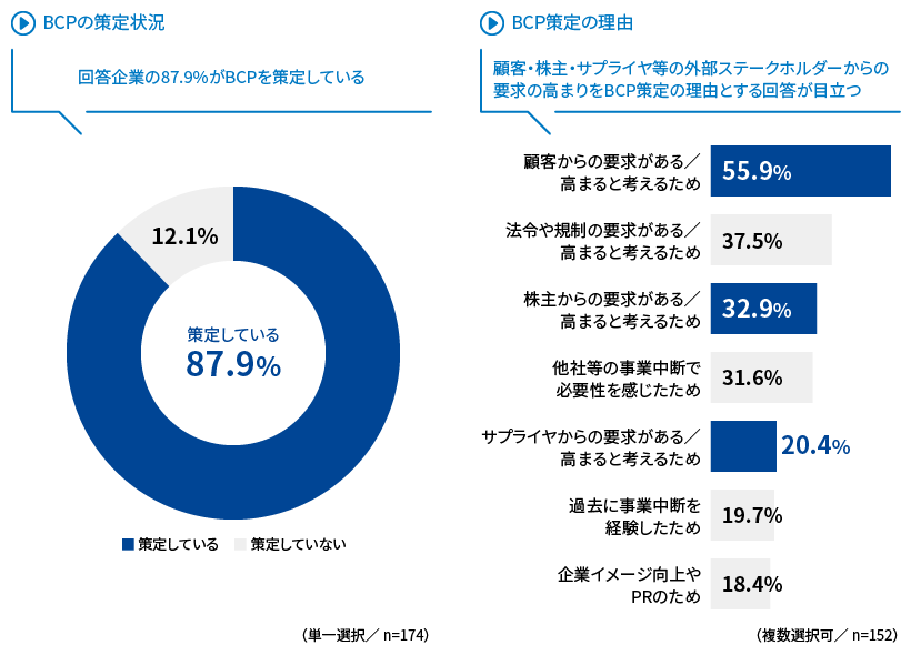 BCPを策定していると回答した企業は87.9%にのぼり、過去の調査と比較して最も高い策定率となりました。BCP策定の理由としては、「顧客からの要求がある/高まると考えるため」(55.9%)や「株主からの要求」(32.9%)、「サプライヤからの要求」(20.4%)など、外部ステークホルダーからの要求の高まりを理由とする回答が多く見受けられ、対外的な事業継続への責任意識の高まりがうかがえます。