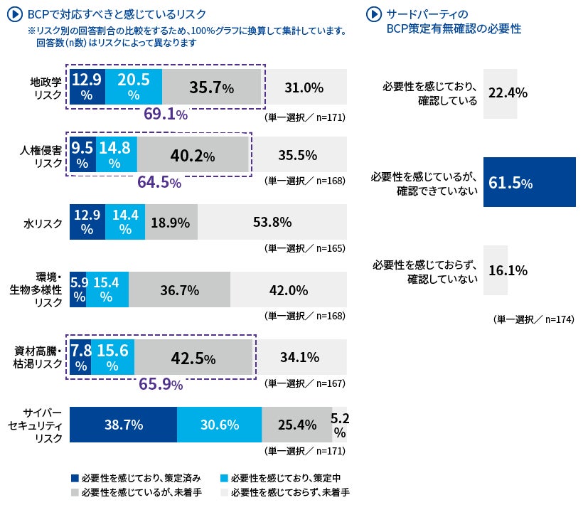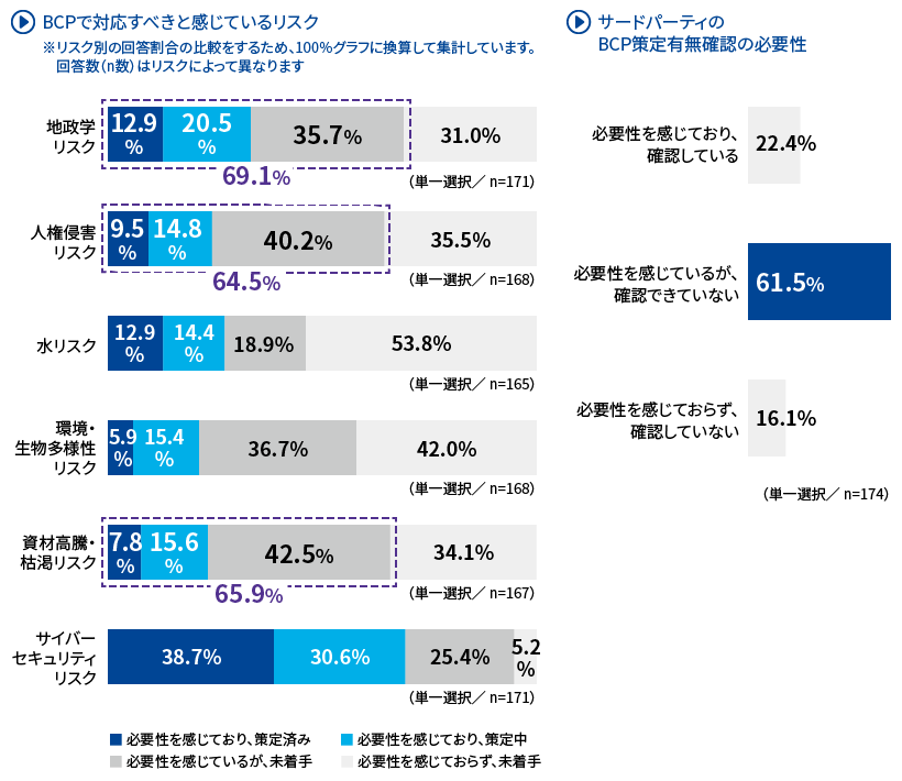 多くの企業が「地政学リスク」(69.1%)、「人権侵害リスク」(64.5%)をはじめとするエマージングリスクを、今後BCPで対応すべきリスクとして認識していることがうかがえます。また、自社に限らずサードパーティについても83.9%の企業がBCP策定の必要性を感じています。今後に向けた取組みとして、すでにBCPを策定している企業も含めて、エマージングリスクやサードパーティの観点から見直すことで、より一層レジリエンスを強化することができるといえます。