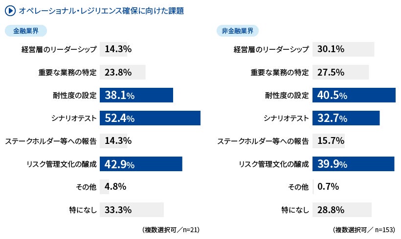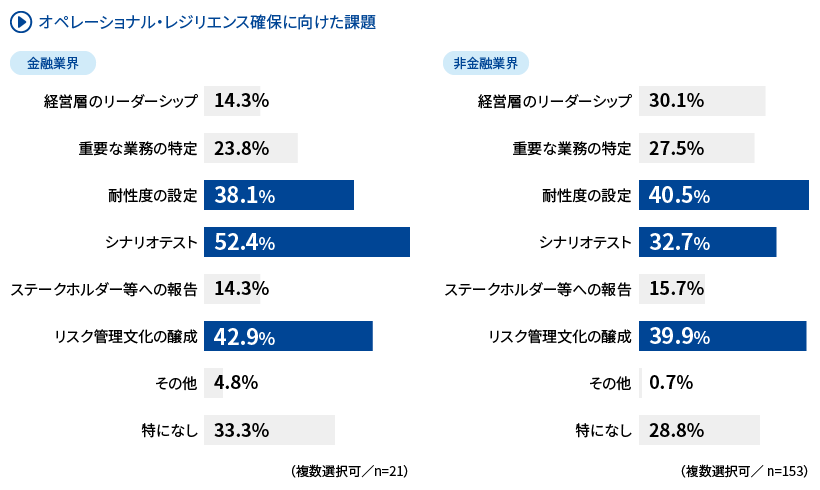 オペレーショナル・レジリエンス確保に向けて認識されている課題として、多くの回答企業(金融業界/非金融業界)が、「シナリオテスト」、「リスク管理文化の醸成」、「耐性度の設定」と回答しました。