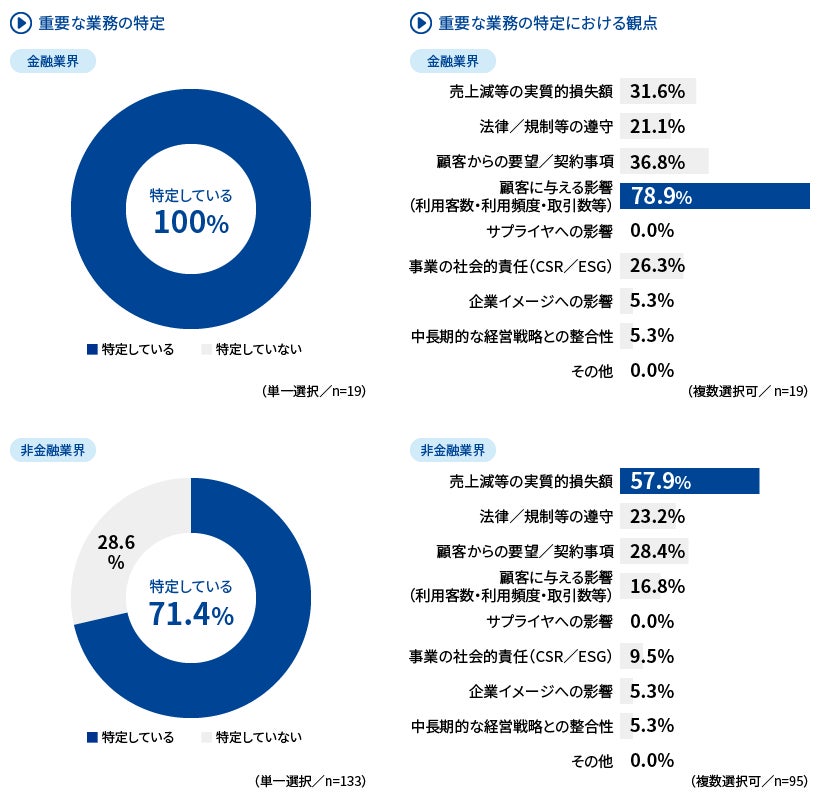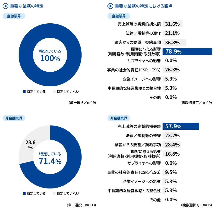 オペレーショナル・レジリエンス確保に向けた取組みが先行している金融業界では、「重要な業務の特定」において、全回答企業が「特定している」と回答しています。一方で非金融業界においては、71.4%が「特定している」と回答しています。特定における観点として、金融業界では「顧客に与える影響」(78.9%)が最も多く、利用者視点でのサービス提供を意識している傾向が見られます。一方で、非金融業界においては「売上減等の実質的損失額」(57.9%)が最も多い結果となりました。