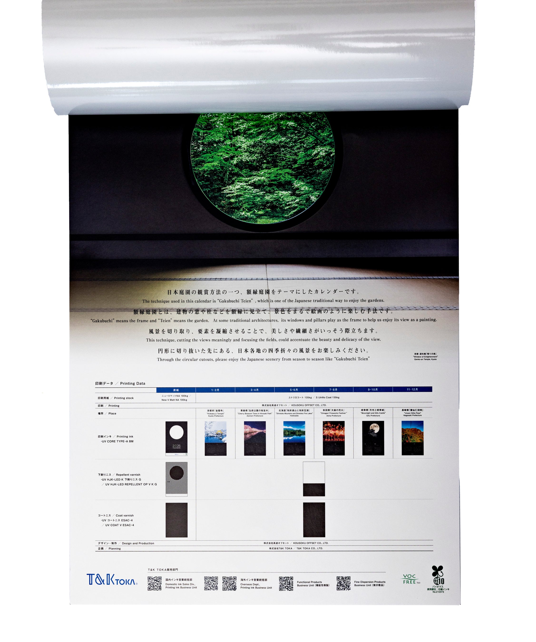 日本庭園の鑑賞方法の一つ、「額縁庭園」をテーマにしたカレンダー。疑似エンボスやトムソン加工、切り取り線などの加工を盛り込みました。