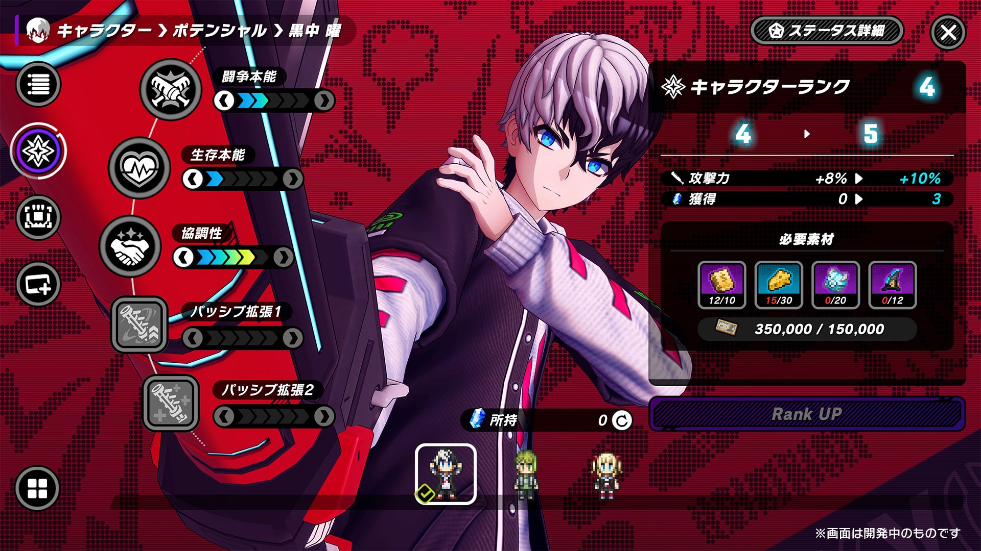 本作では、キャラクターたちの個性をより際立たせる、自由度の高い育成システムを採用しています。レベルアップやステータスの割り振り、装備品の付け替えなどを通じて幅広いビルドが可能です。