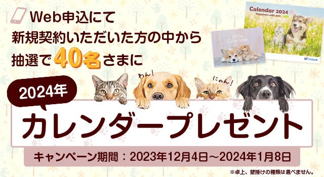 当社Webサイトにて「プリズムペット」にご契約をいただいたお客さまの中から抽選で40名の方に「当社オリジナルワンにゃんカレンダー」をプレゼントいたします。