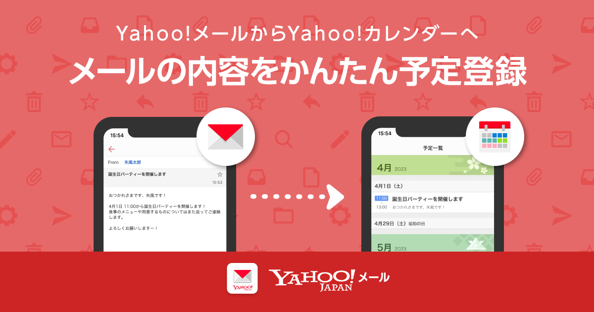 ヤフー株式会社(以下、Yahoo! JAPAN)が提供する「Yahoo!メール」(パソコン版、iOS版、Android版)は、受け取ったメールの内容をメール画面上から「Yahoo!カレンダー」に登録できる機能を提供開始しました。