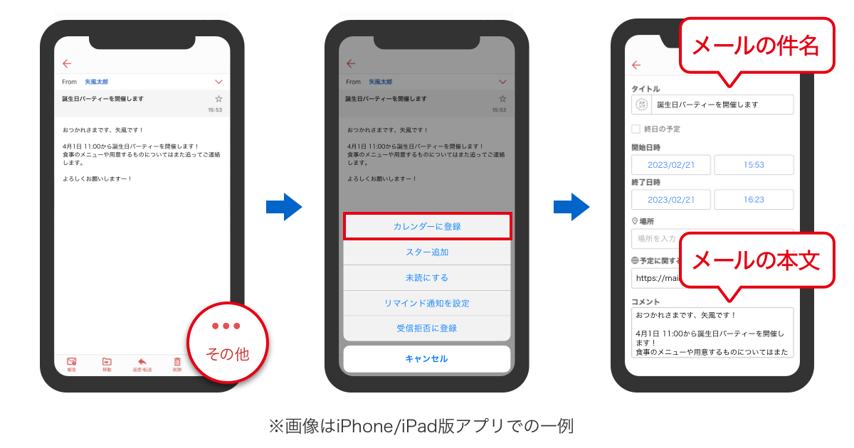 3. 予定登録画面で必要に応じて日時・場所などを入力(※2)