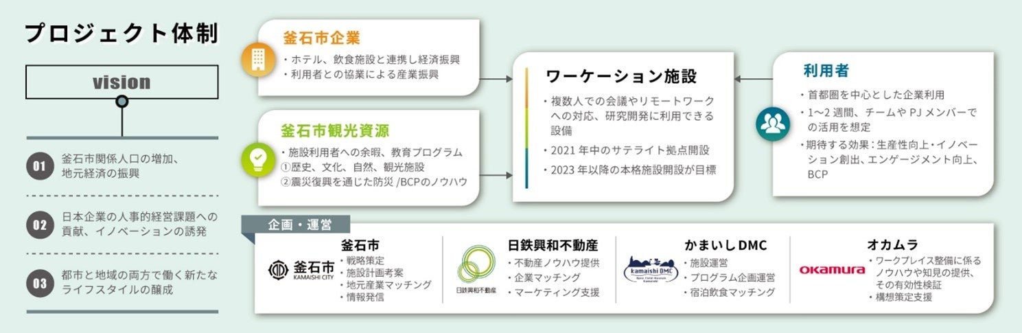 2021年3月26日、釜石市と、かまいしDMC、ならびに日鉄興和不動産は、地方創生とこれからのワークスタイルの研究・提案を目的として、釜石市におけるワーケーション事業の実施に向けた包括連携協定(以下:「本協定」)を締結いたしました。同年10月には、オカムラが本協定に参画し、4者連携のもと、釜石市内に「Nemaru Port(現:NEMARU PORT - hanare -(ねまるポート はなれ))」を開設。首都圏のワーカーを主な対象とし、自然体験や地域貢献活動など、釜石ならではの体験や釜石市のさまざまな人・団体を通じたワーケーションプログラムを展開してきました。