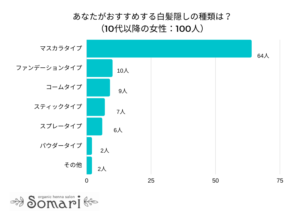 株式会社AWA(https://a-w-a.co.jp/)が運営する地域密着型白髪染め専門美容室ソマリ(https://a-w-a.co.jp/hennasalonsomari/)は、日本全国の10代以上の女性を対象に「あなたがおすすめする白髪隠しの種類は?」とアンケート調査を実施しました。