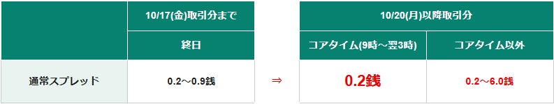 この度当社では、外国為替市場の取引参加者が多く、流動性が高まる9時から翌3時の時間帯を、新たにコアタイムに設定いたします。コアタイムの米ドル/円の通常スプレッドを「0.2銭」に縮小することで、これまで以上にお客様にお取引いただきやすい環境を提供してまいります。