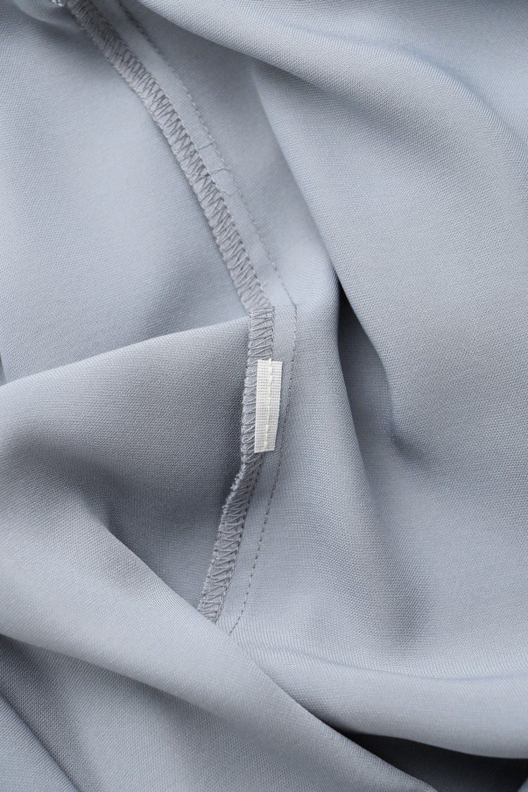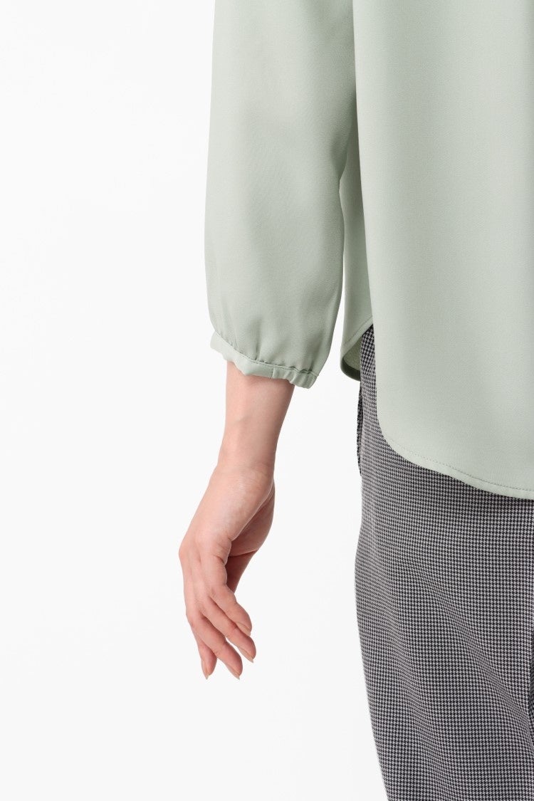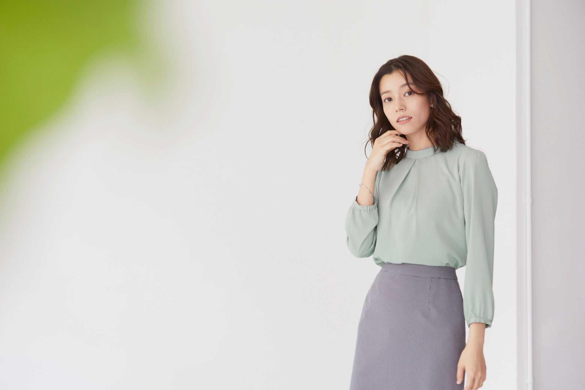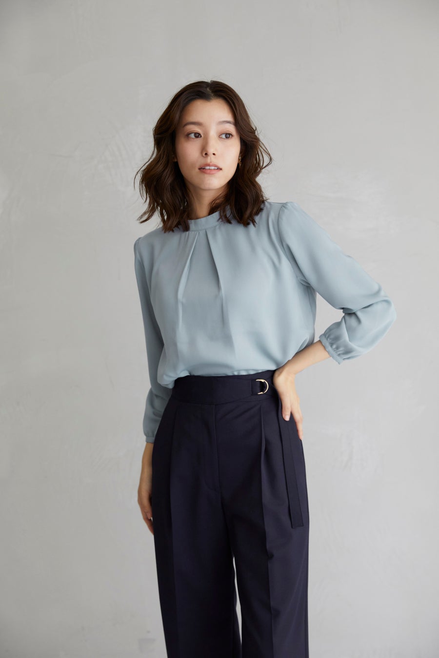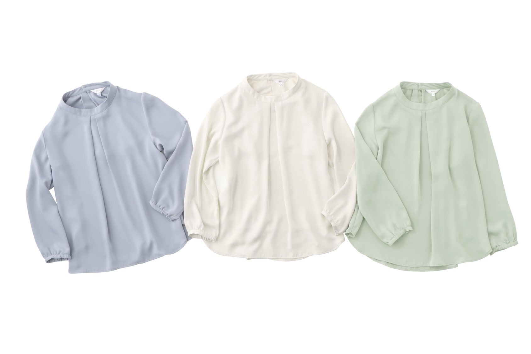 今回発売するブラウスは、同企画の“『美ジ楽スーツ』に合う”をテーマに、ジャケットを羽織った際に胸元がきれい見えるように作製しました。先に完成させていたVカラージャケットの『美ジ楽スーツ』に合わせながらタックの幅や数を調整しました。フォロワーの方々からの「かがんだ時に胸元を見せたくない」「首の詰まったデザインがいい」といった声を反映し、首周りはハイネックにすることでお辞儀など前かがみになった際にも安心です。また、袖口は「デスクワークで袖口が汚れるのが気になる」という声から内側半分をゴム仕様にすることで、腕まくりがしやすくなることに加えて、見た目もすっきりとしたデザインとなっています。カラーは『美ジ楽スーツ』のネイビーやグレーと合うブルー・アイボリー・ライトグリーンの3色を選定。少し光沢のある素材を採用することで上品さを演出しました。