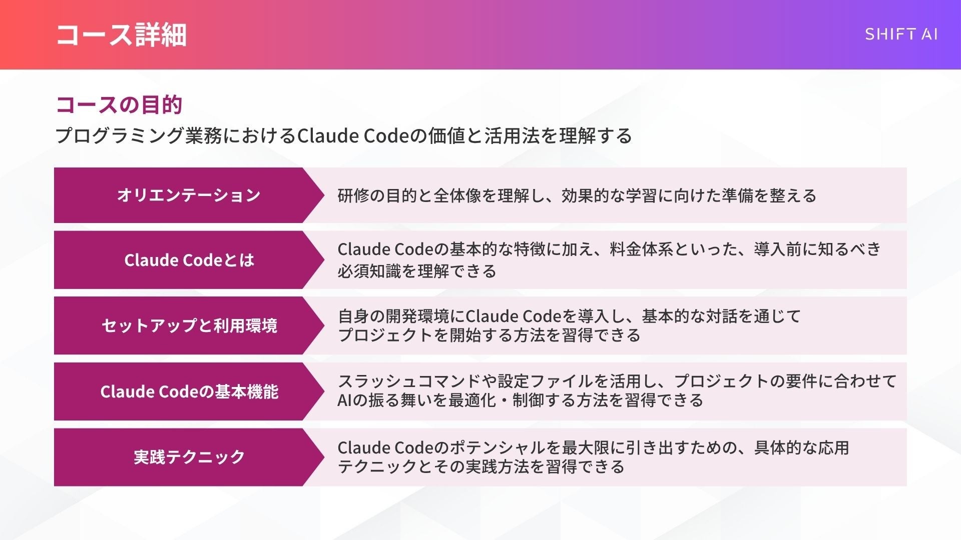 「日本をAI先進国に」を掲げAIのビジネス活用を学べる利用者数No.1※の生成AI学習コミュニティ「SHIFT AI」を運営する株式会社SHIFT AI(東京都渋谷区、代表取締役 木内翔大、以下当社 )は、2025年10月6日より提供している法人向け生成AIリスキリングサービス「SHIFT AI for Biz」の「Claude Codeコース」 を、2025年11月18日より大幅にアップデートすることをお知らせします。 今回のアップデートでは、既存の環境構築中心の内容 に加え、新たに「ワーク(演習)付きの基本機能解説」と「応用テクニック解説」を追加。受講者がClaude Codeを「知っている」段階から「使いこなせる」段階へとスムーズに移行できるよう、より実践的なカリキュラムへと強化しました。