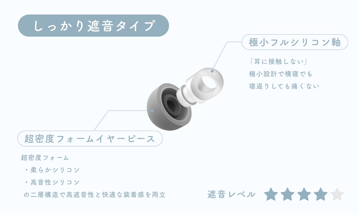 「やさしい遮音タイプ」は、傘部分と軸部分とで異なる硬度のシリコンを採用したイヤーピース『TYPE E』が、低音域の改善や遮音性の向上及び、高音域で気になる刺激音を低減してくれます。装着感にもこだわり、耳道が無理に押されている感覚を軽減し、快適な着け心地を実現しました。