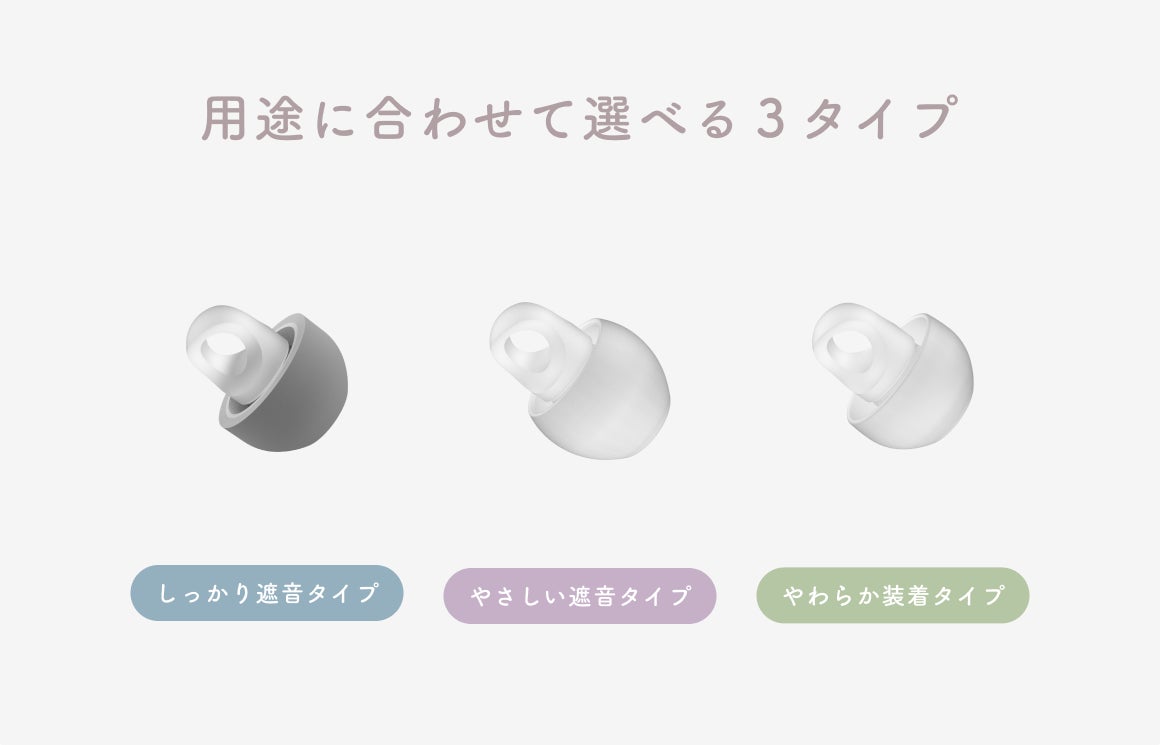 シーンや用途に合わせ、計3種類の「YOKONE 横寝」をご用意。「しっかり遮音タイプ」はFUSION-G、「やさしい遮音タイプ」はTYPE E、「やわらか装着タイプ」はTYPE Pのイヤーピースを採用しました。