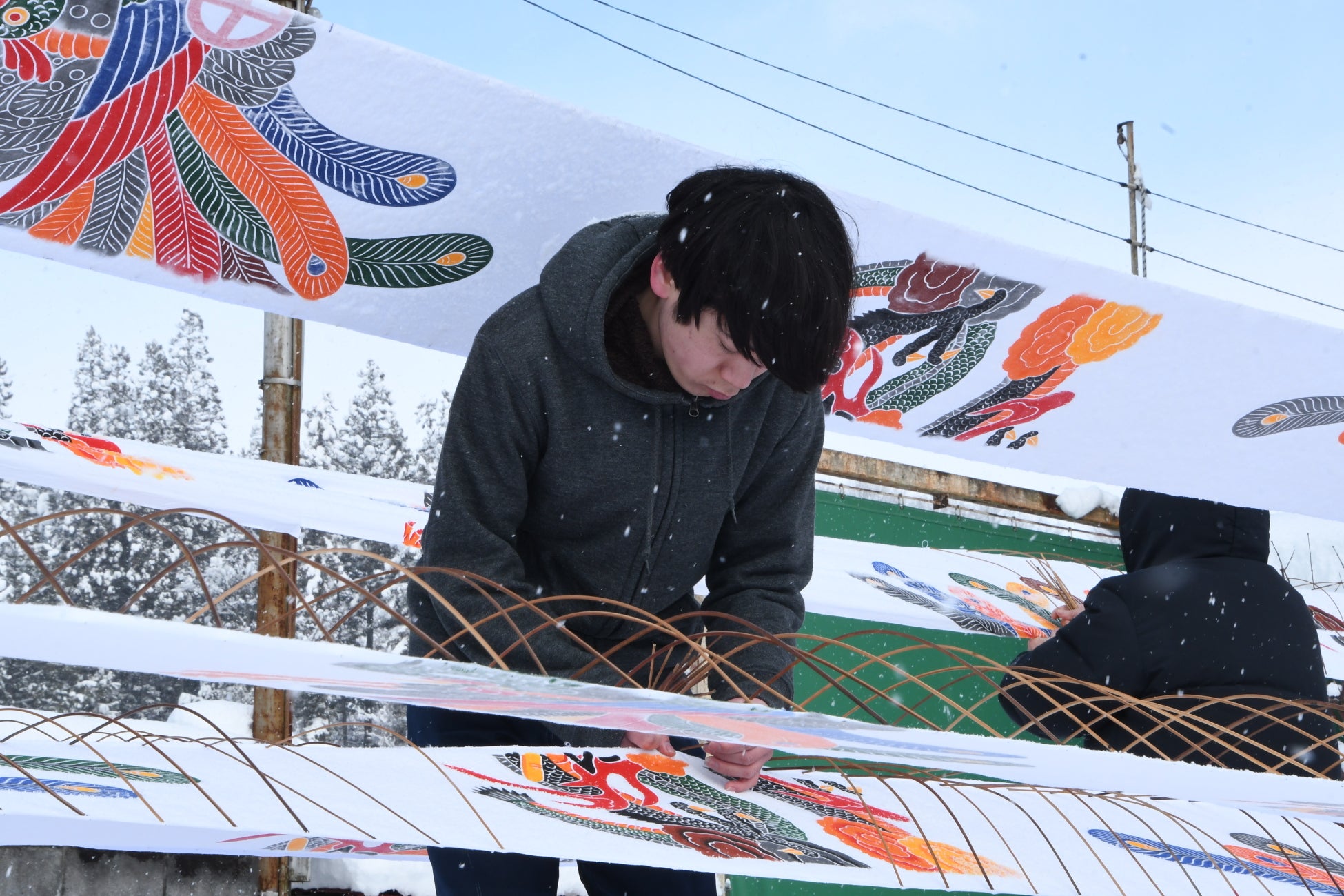 この日の最低気温は氷点下5.4度。雪の上で冬の日差しと冷たい風にさらすと、太陽光が雪に反射しオゾンが発生することで白い部分が漂白され、より色が際立ちきれいに仕上がり、寒い中に干すことで大豆の成分を含む顔料が凍って透明感が出るとのことです。