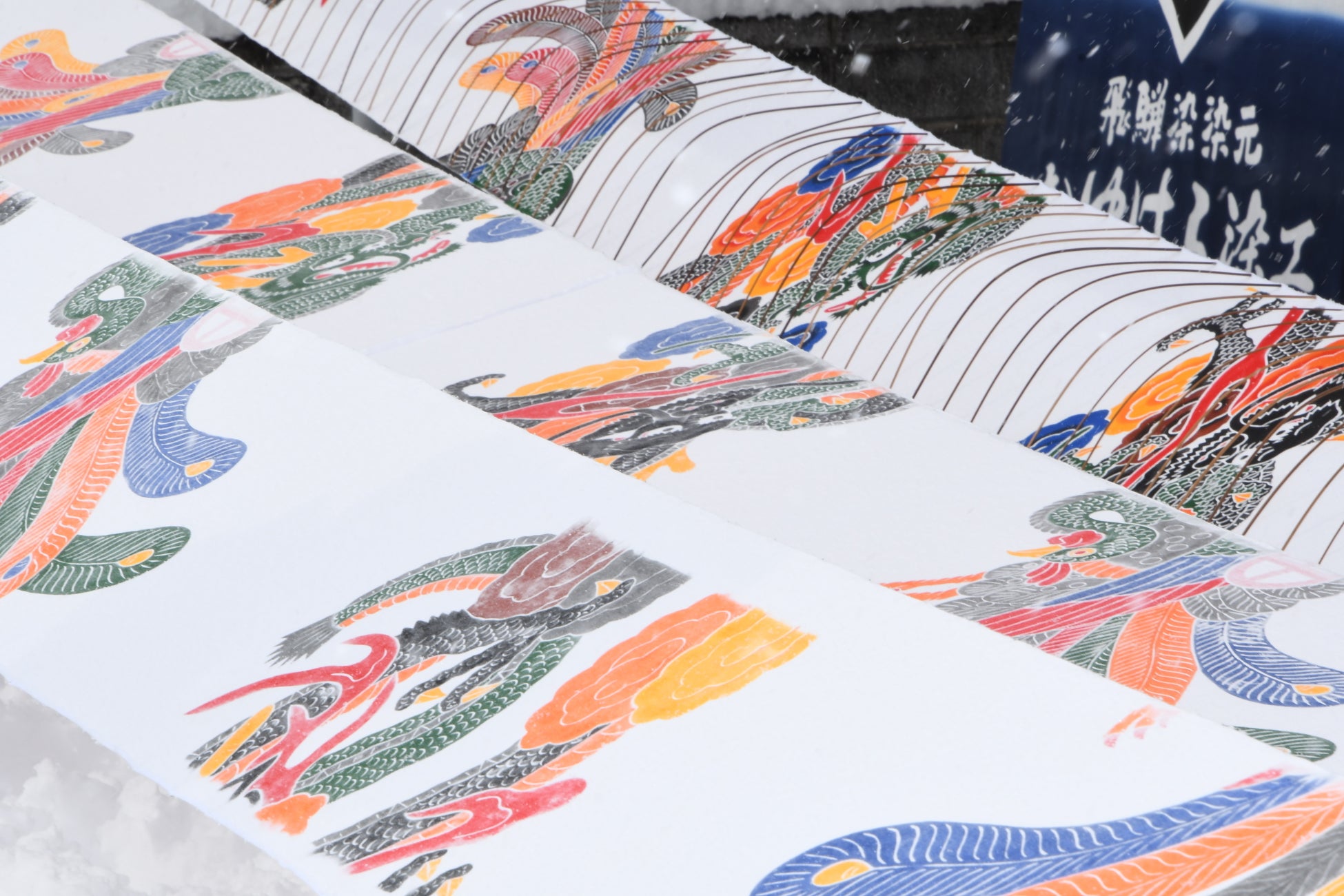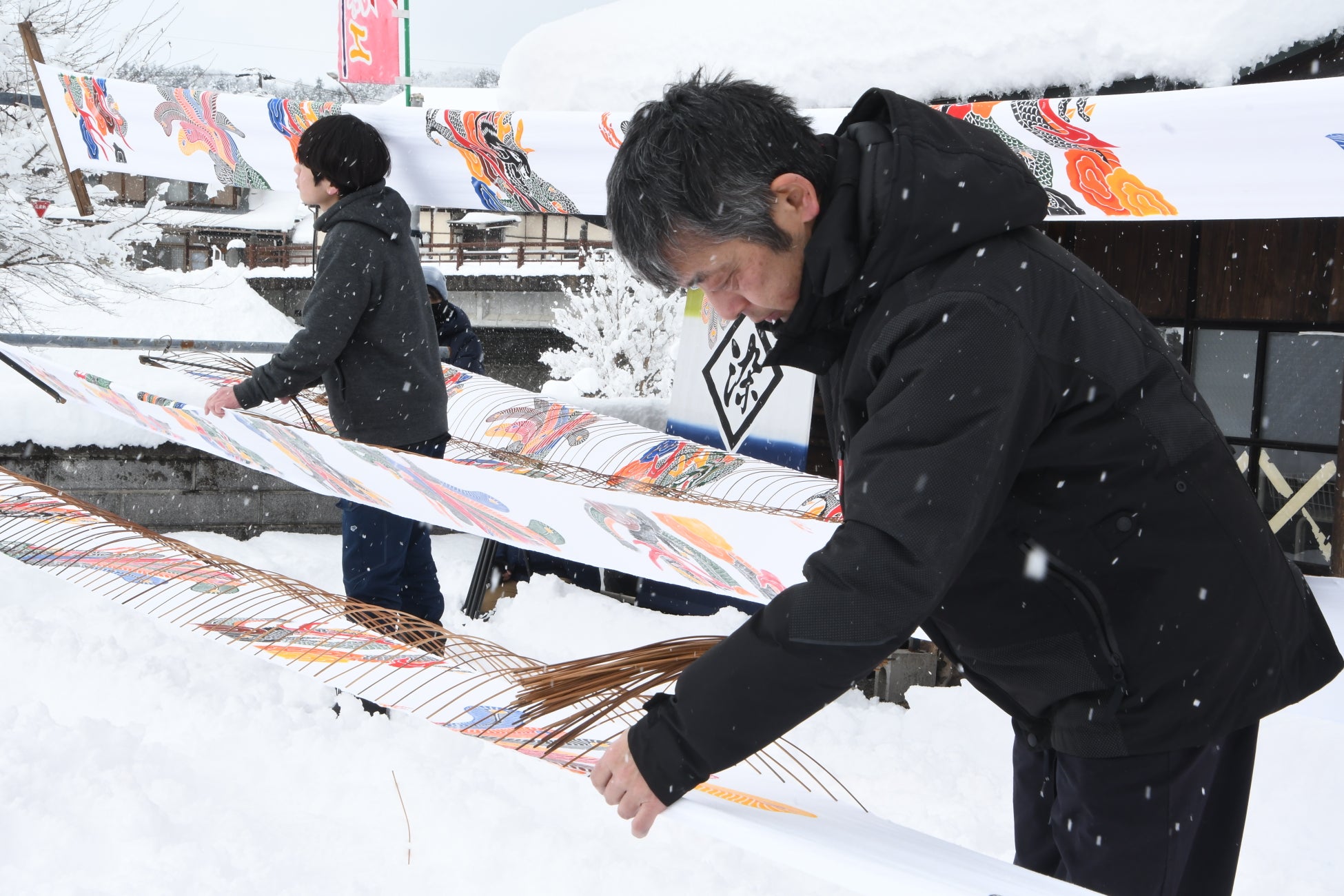 高山市で唯一、祭衣装を手がける染物店「ゆはら染工(松本町)」では、年明けから飛騨染の作業を開始しましたが、雪不足で作業を一旦中断。ようやく降雪があったため、令和7年2月7日(金)より寒ざらしの作業を再開しました。小雪が舞う厳しい寒さの中、従業員は、竜や鳳凰などが描かれた約12メートルの生地(反物)に竹ひごを取り付け、しわができないように伸ばします。