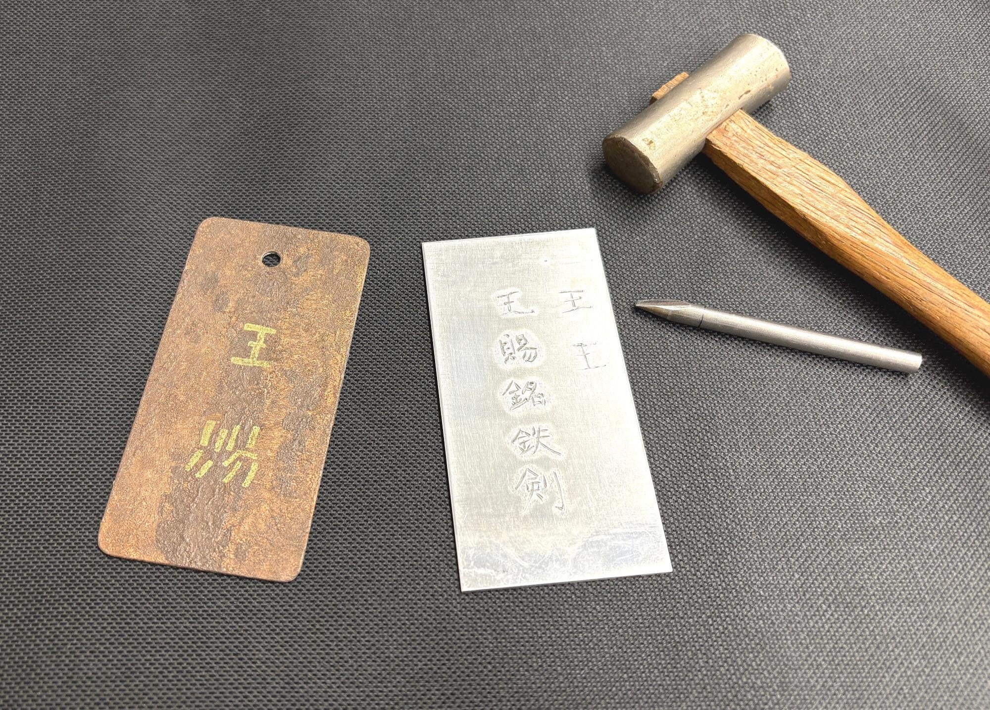 王賜銘鉄剣にも同じような技法が使われている、鏨(たがね)を使ったネームプレートづくりです。