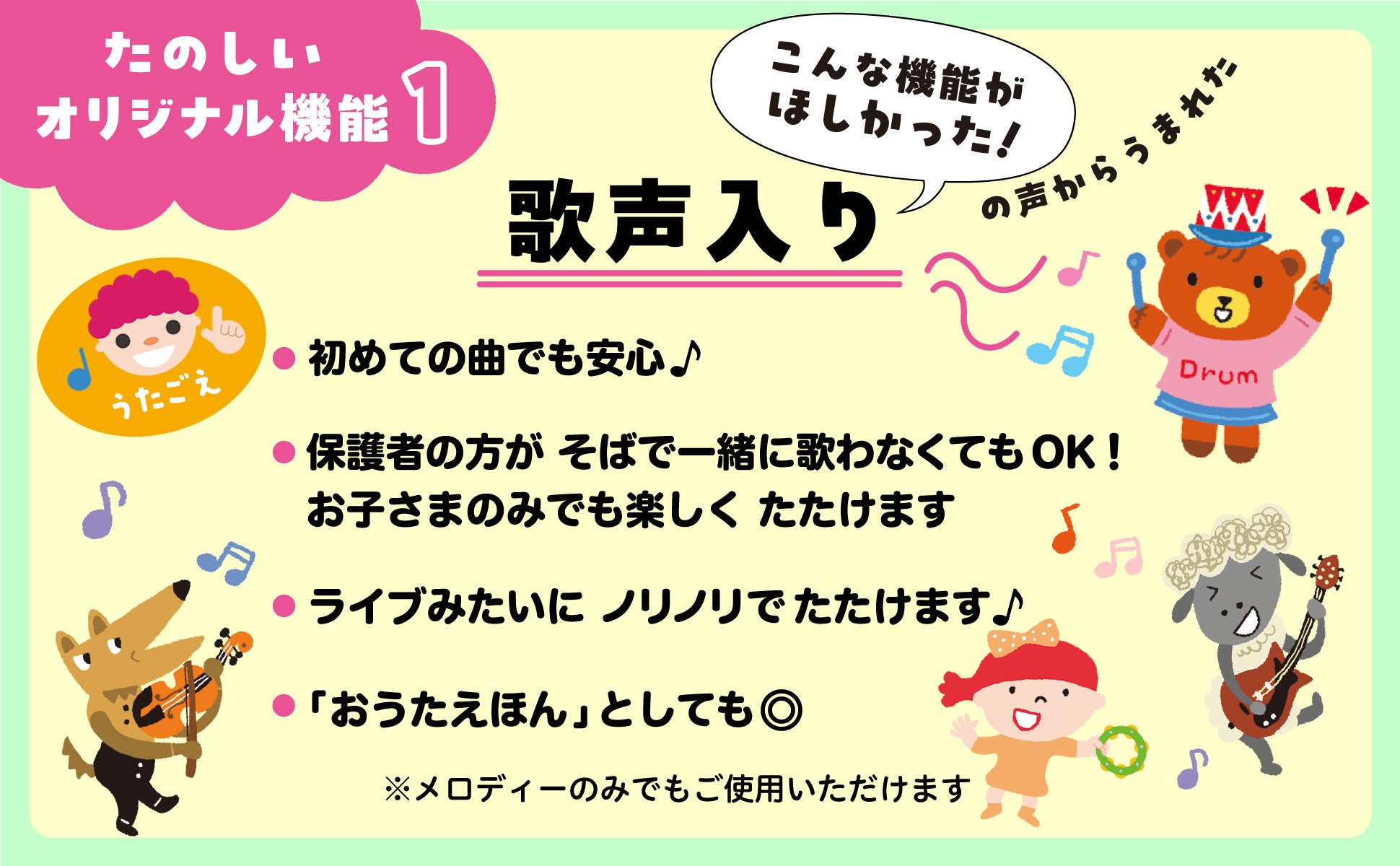 ・歌声入りだからはじめての曲でも安心。ひとりでもたたけます♪