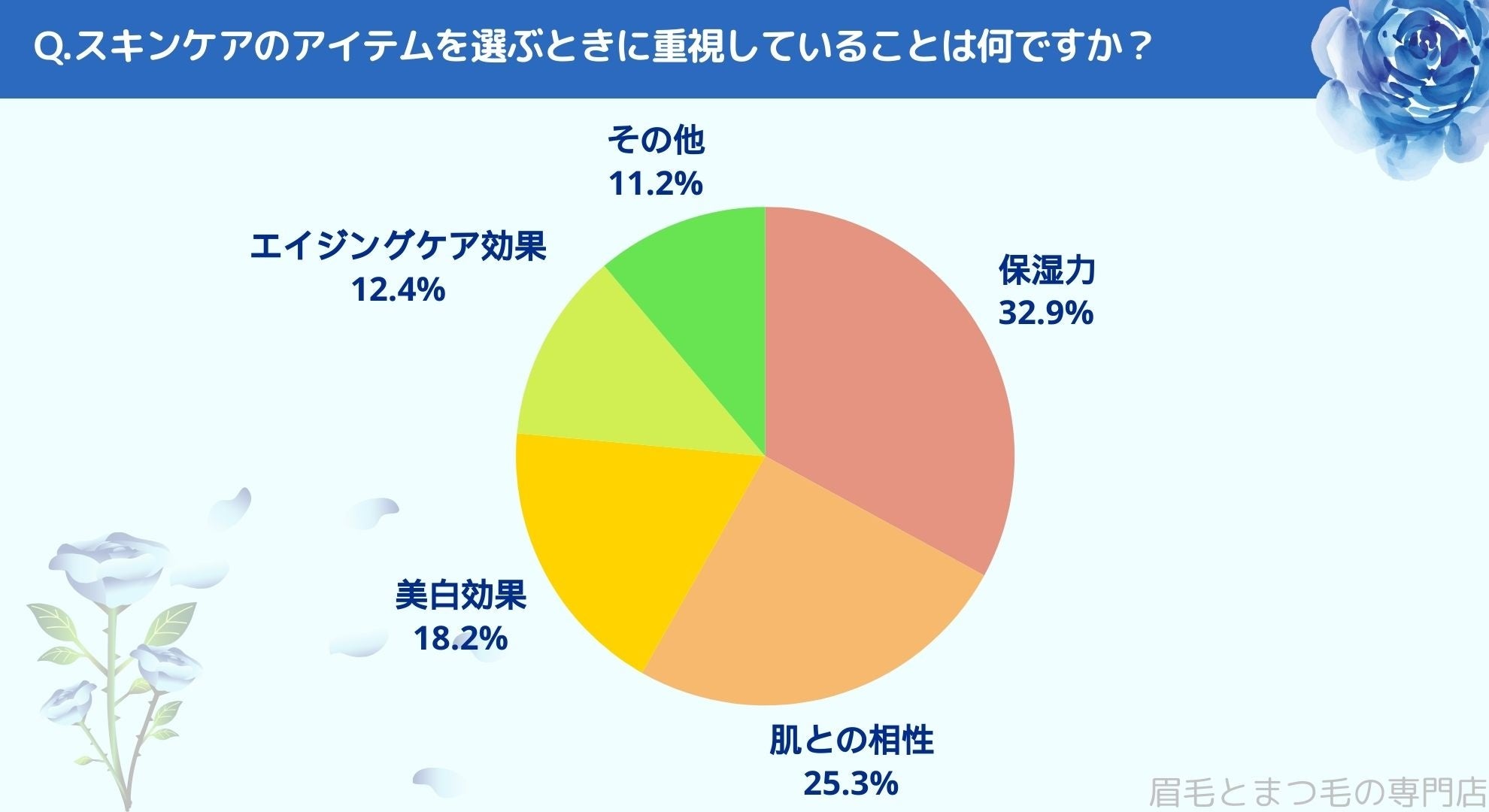 スキンケアのアイテムを選ぶときに重視していることをお聞きしたところ「保湿力(32.9%)」、「肌との相性(25.3%)」、「美白効果(18.2%)」、「エイジングケア効果(12.4%)」、「その他(11.2%)」という結果になりました。