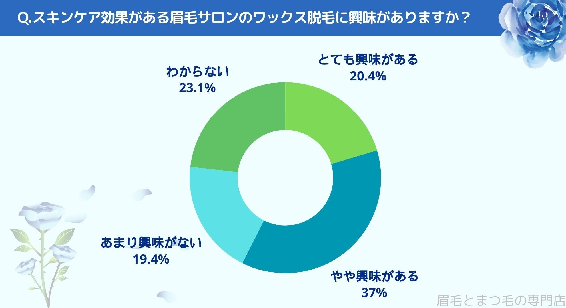 スキンケア効果がある眉毛サロンのワックス脱毛に興味があるかお聞きしたところ「とても興味がある(20.4%)」、「やや興味がある(37%)」、「あまり興味がない(19.4%)」、「わからない(23.1%)」という結果になりました。