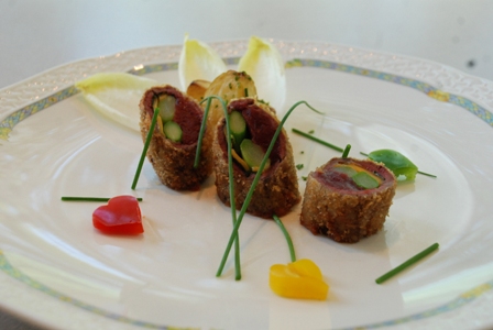 料理は前菜、メイン料理、デザートの三品で競われました。優勝した福島県チームは、前菜に「かき揚げ」、「会津そば」、「トマトのグリエ」など福島県の郷土色を出し、メインの料理は福島の会津地方で親しまれている「馬肉」を用いました。また、デザートはクレープとフルーツを使った一品で、いずれもプロ顔負けの手際のよさで優勝に輝きました。ホテルでは、三品のほかにスープ、サラダ、かやくご飯、コーヒーを加えお一人様3,980円(サービス料・税金込)で販売いたします。また、デザートのみ単品でも780円(サービス料・税金込)でご用意いたします。