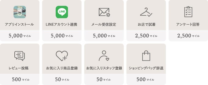 オンラインストアでの商品のお気に入り登録、ショッピングバッグのご辞退など、お買い物以外の様々なアクションでもマイルが貯まります。
