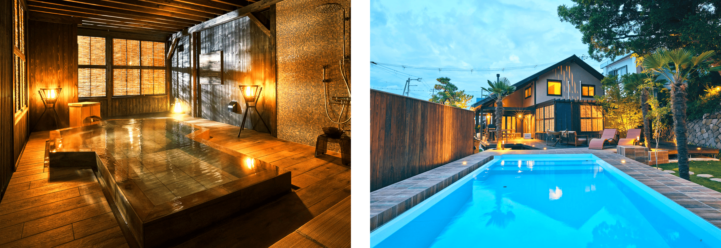 - 露天風呂と内湯で楽しめる温泉と貸切プール