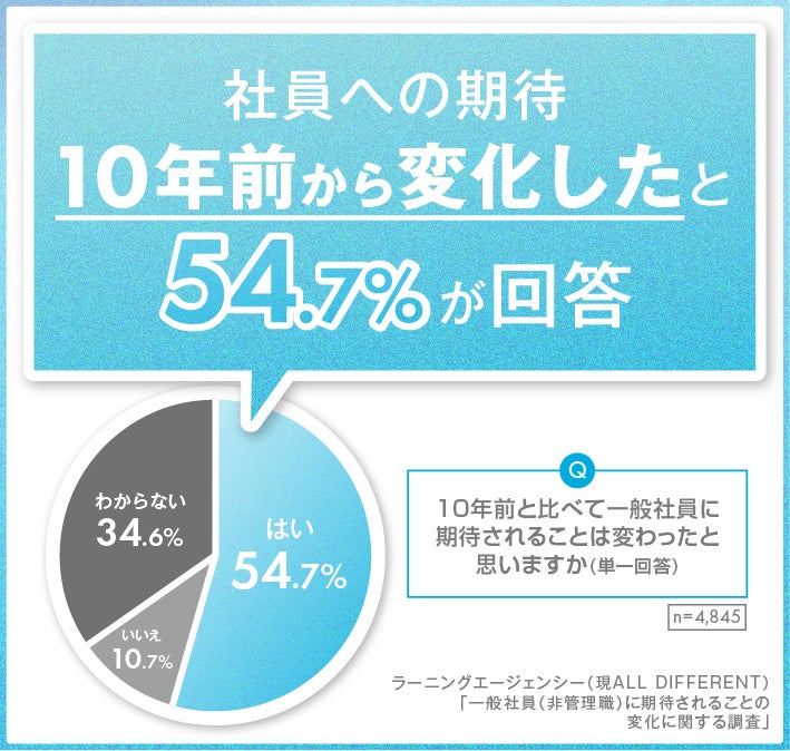 近年、外部環境の変化などに伴い、従業員に求められるスキルは大きく変化しています。当社の調査結果*によると、「10年前と比べて社員に期待されることは変わった」と感じている社会人は54.7%と、「変わっていない」(10.7%)を大きく上回る結果になりました。