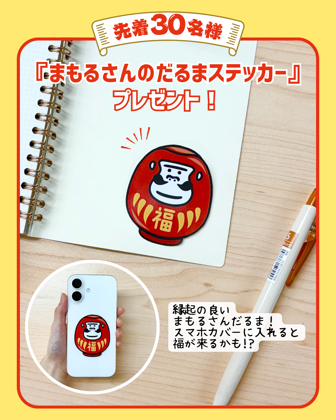 また、2026年の福袋では先着30名にオリジナルの「まもるさんだるまステッカー」をプレゼント。