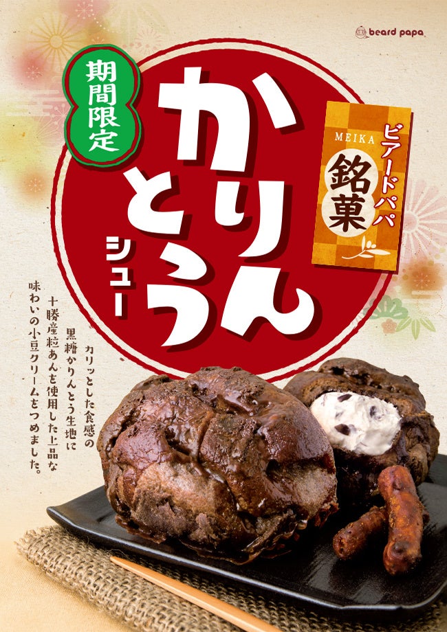 “かりんとうシュー”は黒糖蜜で二度焼きしカリッとした食感のかりんとう生地に十勝産小豆入りのふんわりとしたクリームを合わせ和風の味わいに仕上げました。コク深い黒糖と甘さ控えめのクリームとのバランスが絶妙です。