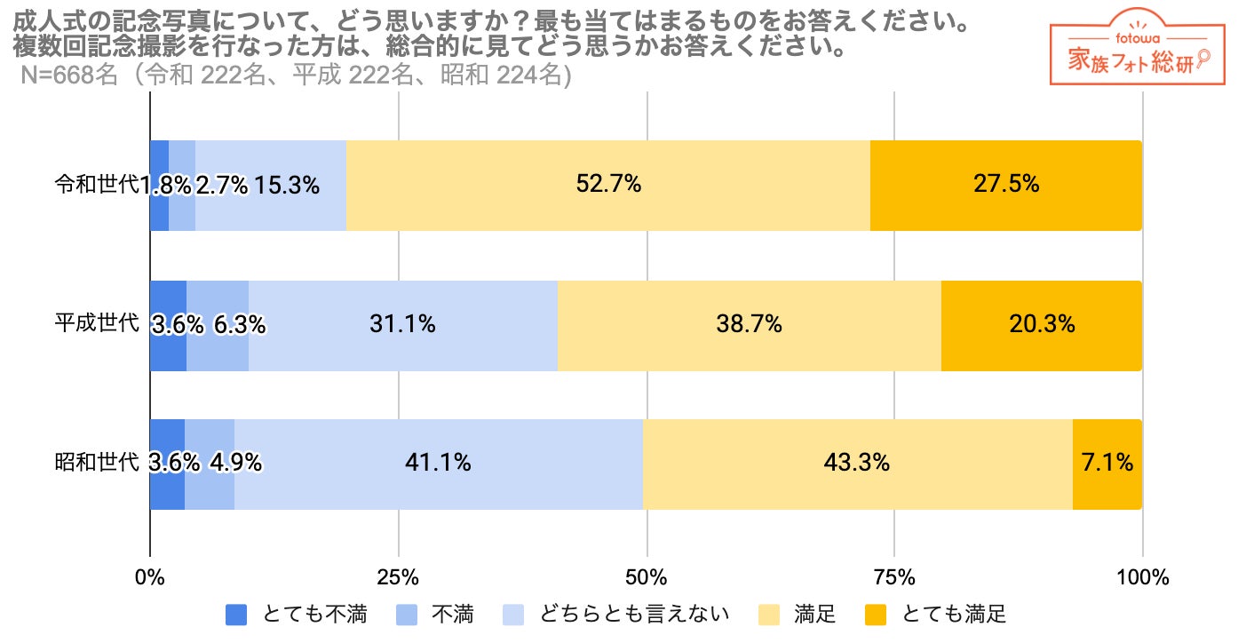 家族・子ども向け出張撮影プラットフォーム「fotowa(フォトワ)」(ピクスタ株式会社/東京都渋谷区)が運営するfotowa家族フォト総研は、昭和・平成・令和の各時代において成人式を迎えた方々を対象に「成人式に関するアンケート」を行い、668名より回答を得ました。
