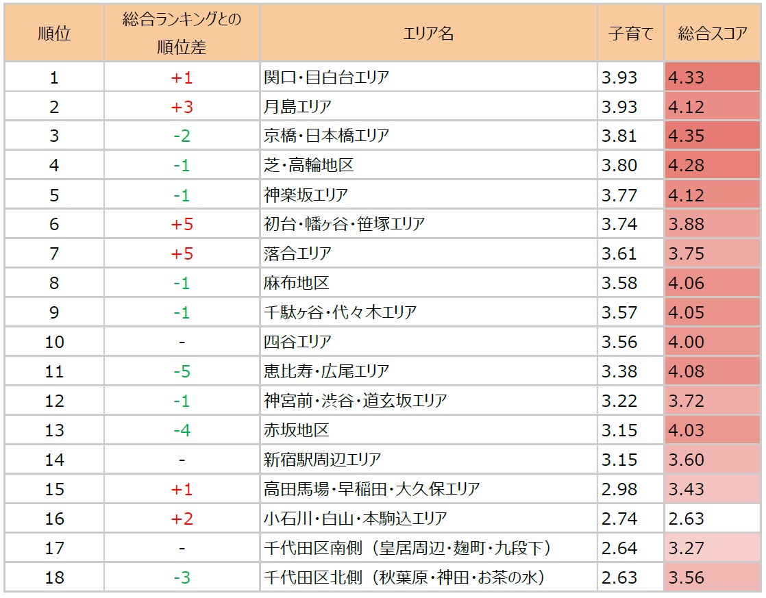 総合スコアランキングでは振るわなかったエリアと子育てスコアランキングの比較をしたところ、順位のランキングの乖離があまり見られませんでした。
