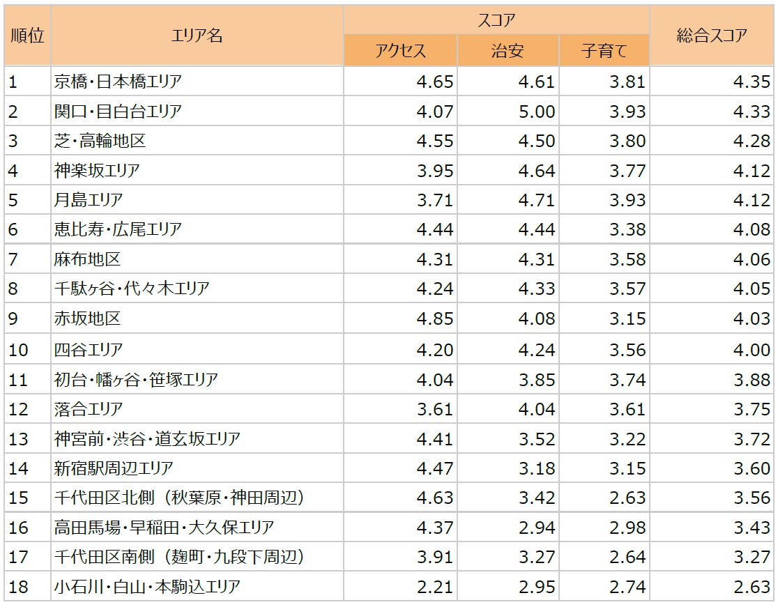 ただし、千代田区全体(17・18位)はアクセスが比較的高いのにもかかわらず、総合ランキングでは下位に位置していました。日本の代表的なオフィス街であることからも子育てをしやすい環境があまり整備されていないのではないかと推測できます。主要スーパーも商品価格が比較的高めの店舗がメインである上、家賃相場も他地域と比べると高いので、住む・子育てには出費が重なるエリアになるでしょう。