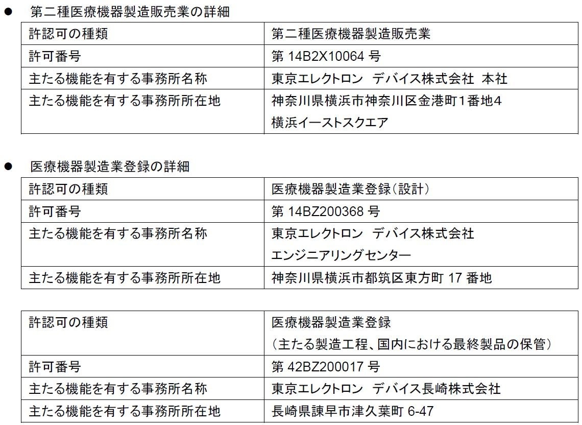 東京エレクトロン デバイス株式会社 (本社:横浜市神奈川区、代表取締役社長:徳重 敦之、以下TED)では、2022年1月17日に本社での第二種医療機器製造販売業許可の取得、2021年12月19日にエンジニアリングセンターでの医療機器製造業の登録および2022年2月15日東京エレクトロン デバイス長崎株式会社(以下、TED長崎)での医療機器製造業登録を行いましたのでお知らせいたします。
