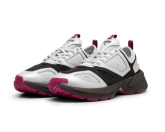 また、Skeptaのお気に入りシューズである「Velophasis(ベロファシス)」のアップデートバージョンもMás Tiempoとのパートナーシップのもと制作されました。この新作は、コレクションのアクセサリーと同じカラーパレットを取り入れ、パープルがあしらわれた洗練されたブラックとグレーのカラーウェイに、ヒールとタンにMás Tiempoのブランドロゴが施されています。