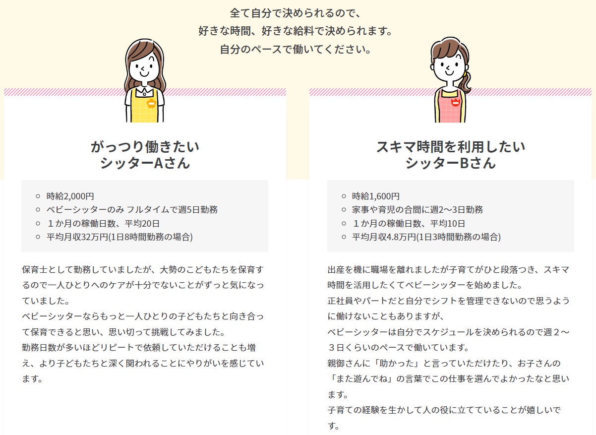 など、それぞれのペースに合った働き方ができるのは、ご自分でスケジュールを管理できるベビーシッターの強みです。