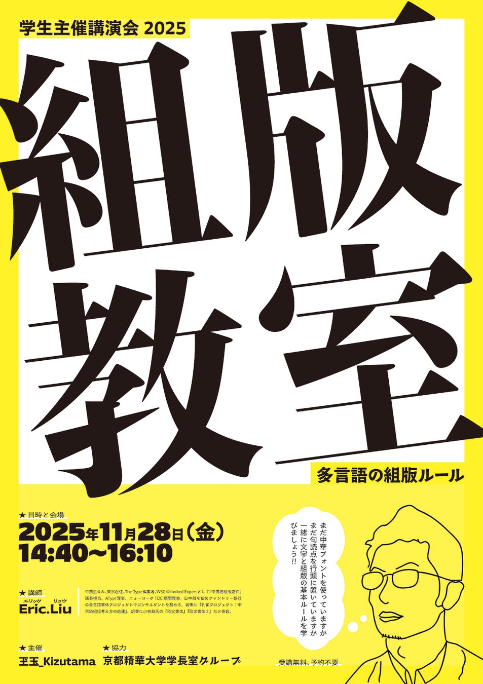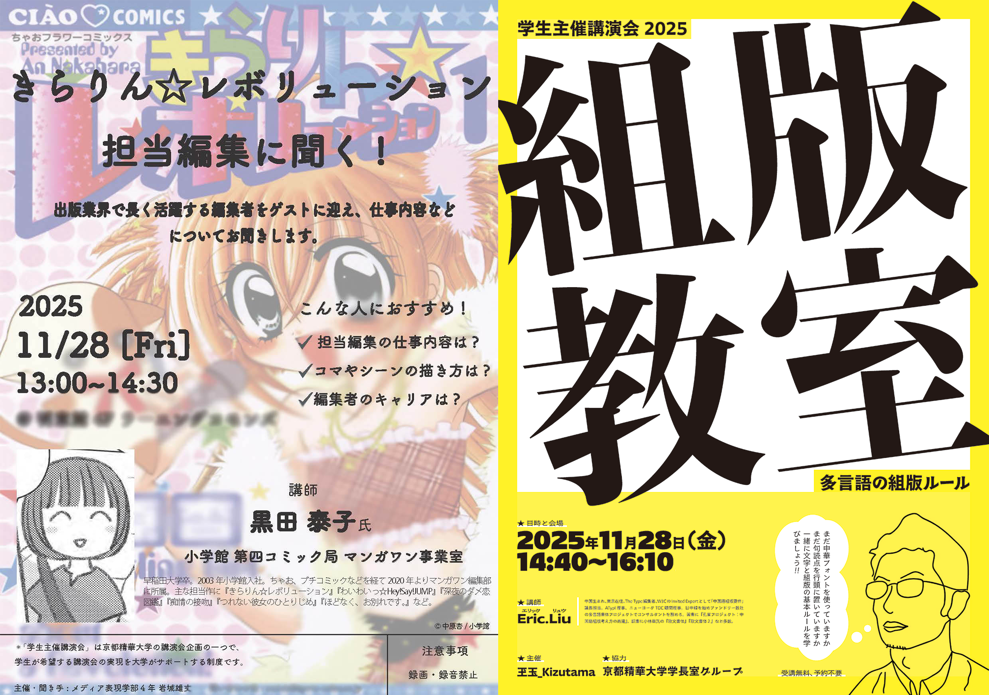 [京都精華大学]学生主催講演会を開催。ゲストにマンガ編集者の黒田 泰子氏、多言語書体コンサルタントのEric.Liu(エリック リュウ)氏をお招きします。