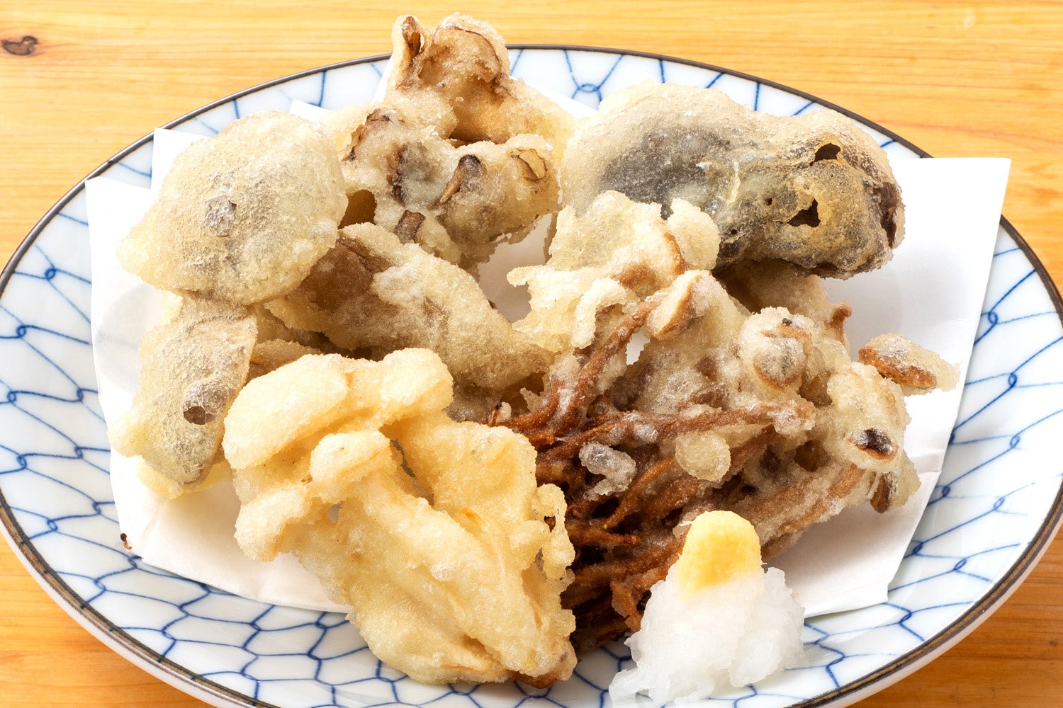 秋といえばキノコです。「旬の木の子 天布羅(500円)」は、しめじ、舞茸、平茸などその日ごとに4~5種類を厳選。キノコが持つ豊かな香りと味を活かすように、板前がカラリと揚げます。キノコ類に含まれる栄養素は血の巡りを良くし、代謝をアップさせる効果が期待されるので、本格的に秋の気候になる10月に楽しんでほしい食材です。