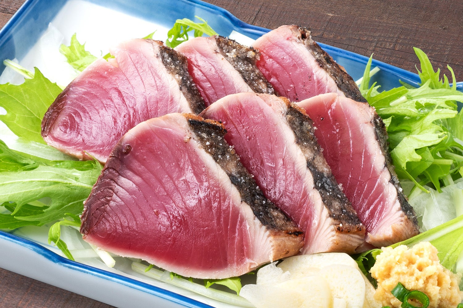 「戻りかつお 塩叩き(600円)」は、板前が絶妙な火加減で炙り、外はパリッと中はトロっと仕上げます。薬味のにんにくスライスやおろし生姜と一緒に食べると、さっぱりと脂の旨味が楽しめます。